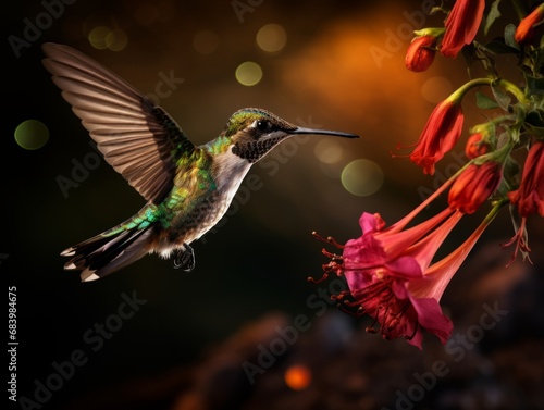 © monsifdx, Naklejka premium Captivating Close-up: The Graceful Hover of a Long-Beaked Hummingbird! Generative AI