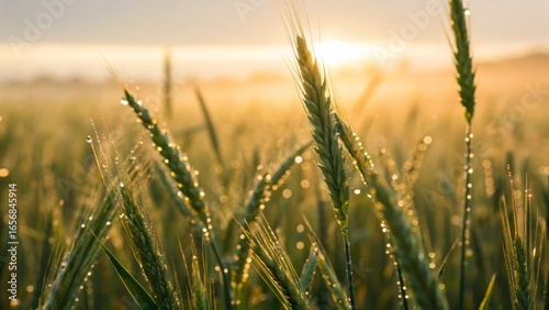 Obraz premium Captivating closeup of dewdrops on fresh wheat stalks at sunrise agricultural...