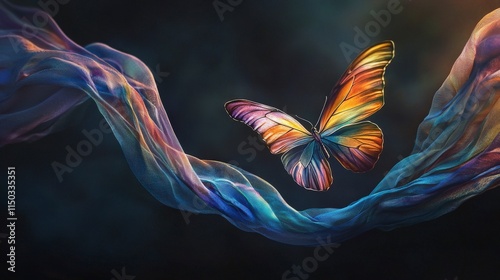 Fototapeta premium Captivating concept of a colorful butterfly soaring amidst surreal fabric ribbons in a dreamlike background