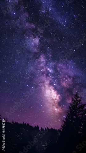 Naklejka premium Captivating Cosmic Landscape with Starry Milky Way Galaxy Over Silhouetted Forest