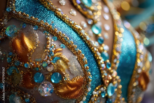 © asya_karton_art, Obraz premium Captivating details of a samba costume highlight the vibrant colors and intricate embellishments during a cultural festival celebration in Brazil's carnival season
