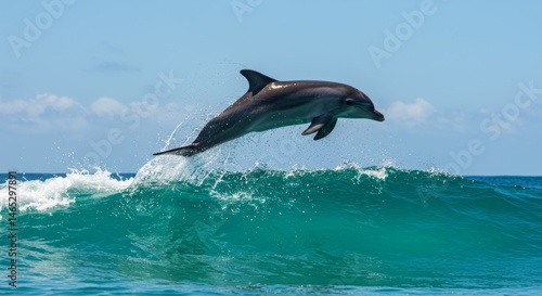 Fototapeta premium Captivating dolphin leaping joyfully out of a turquoise ocean wave