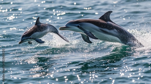 © Barokahe, Fototapeta premium Captivating dolphins leaping together from the sparkling waters of the ocean