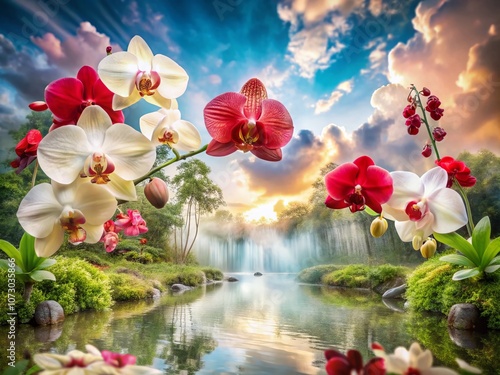 © Supittra, Obraz premium Captivating Double Exposure Photography of Red and White Orchids, Blending Nature's Beauty with Ethereal Elements for Stunning Visual Impact