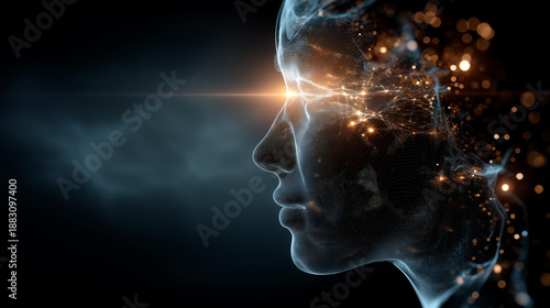 © Laura, Fototapeta premium Captivating faceless digital face with glowing lines and vibrant particles surrounded by cosmic background, abstract identity visualization, with copy space
