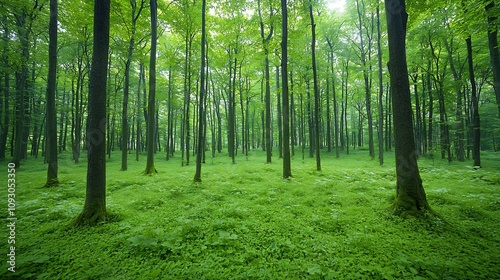 Fototapeta premium Captivating forest landscape with towering trees and lush verdant undergrowth...