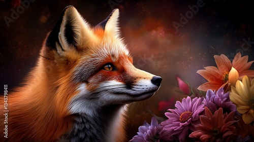 Obraz premium Captivating fox portrait amidst a vibrant floral display with mystic ambiance