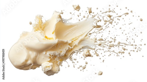 © happysunstock, Fototapeta premium Captivating Frozen Motion of Butter Bubbles Suspended in Air on White Background