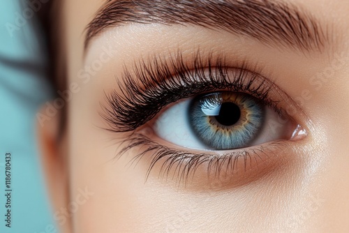 © SSTC AI Photo&Video, Obraz premium Captivating Gaze: Close-up of a mesmerizing blue eye with long, luscious eyelashes, the perfect image for beauty, cosmetics, and vision-related projects.