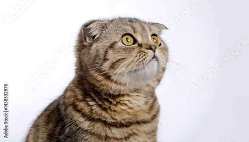 Obraz premium Captivating gaze: Portrait of a brown tabby Scottish Fold on white backdrop