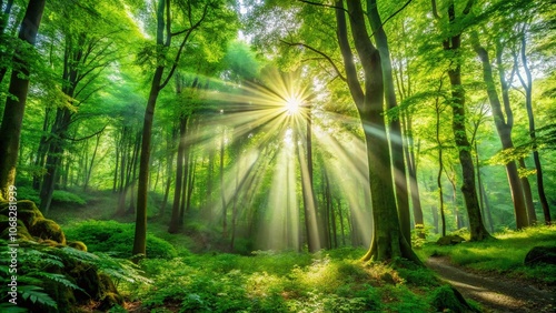 Naklejka premium Captivating Green Forest with Sun Rays Illuminating the Lush Foliage and Creating a Serene Atmosphere in Nature's Embrace - Perfect for Outdoor and Nature Photography Enthusiasts