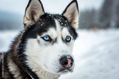 © abdul, Naklejka premium Captivating husky with piercing blue eyes in a snowy winter wonderland, exuding loyalty and adventure