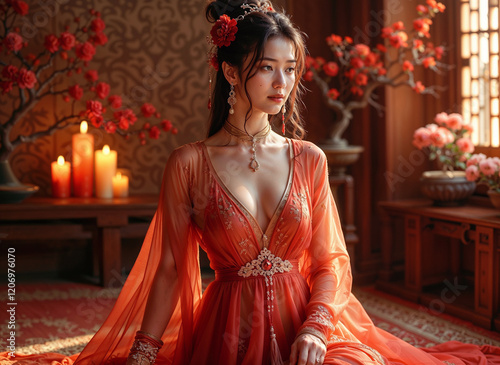 © MrBaks, Fototapeta premium Captivating image of a beautiful woman in traditional Chinese dress. Perfect for fashion, beauty, and culture projects