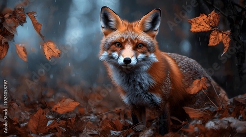 Fototapeta premium Captivating image of a fox standing still and alert its vibrant fur seamlessly blending with the lush autumn leaves of a tranquil forest landscape