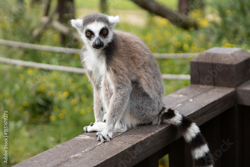Fototapeta premium Captivating Lemur Sitting Outdoors Against a Vibrant Green Background