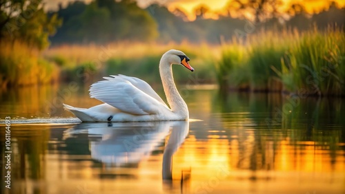 © Arnada, Fototapeta premium Captivating Lonely White Swan Swimming Gracefully on Serene Lake - Elegant Wildlife Photography, Tranquil Nature Scene, Peaceful Lake Reflection, Artful Waterfowl Imagery
