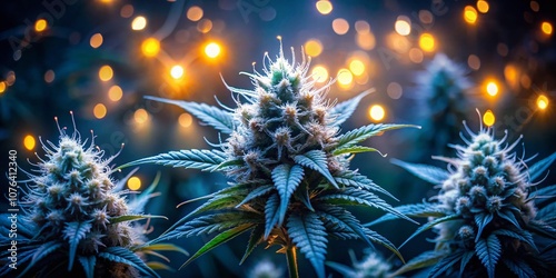 © prapatsorn, Obraz premium Captivating Low Light Photography of White Cannabis Buds Glimmering Under Dim Ambient Light, Showcasing Intricate Trichomes and Unique Textures for Nature and Health Related Themes