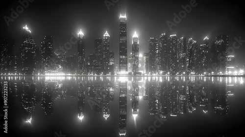 Obraz premium Captivating Minimalist Black and White City Skyline at Night with Sleek Modern Skyscrapers and Serene Reflections