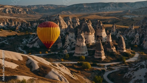 © Yana, Naklejka premium Captivating Morning Views of Cappadocia’s Fairy Chimneys with Vibrant Balloons