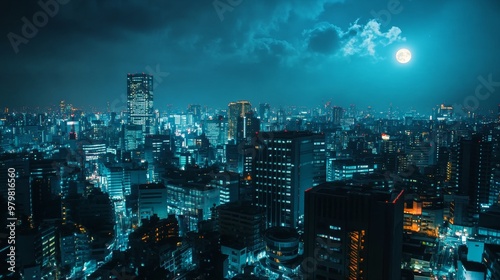 © วรวิทย์ ทรงพลยศ, Obraz premium Captivating Night Cityscape with Glimmering Skyscrapers and Moonlit Sky