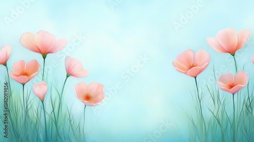 Fototapeta premium Captivating pink floral painting on a serene blue canvas background, modern...