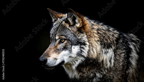 © Akui, Obraz premium Captivating Portrait of a Majestic Wolf Against a Dark Backdrop.