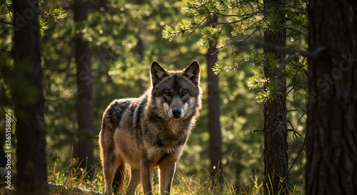 © KHARISMA, Obraz premium Captivating Portrait of a Mexican Wolf amidst the Tranquil Pine Forest