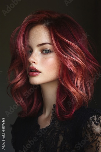© kura, Fototapeta premium Captivating portrait of a woman with rich red hair and soft waves