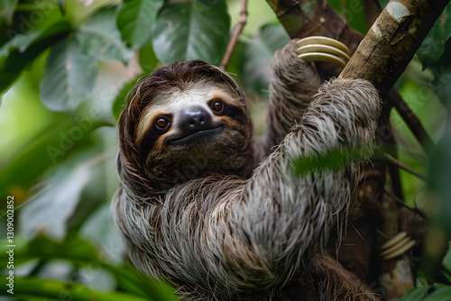 Fototapeta premium Captivating Portrayal of a Sloth Hanging Idly in its Lush Rainforest Habitat