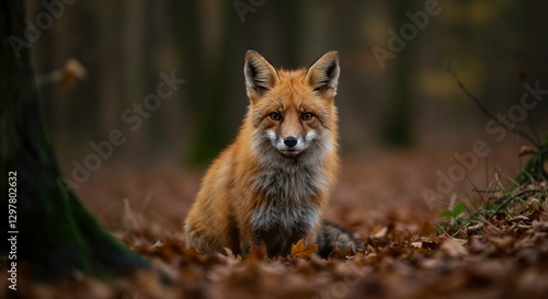 Naklejka premium Captivating Red Fox Contently Observing Forest Floor Covered In Autumn Leaves