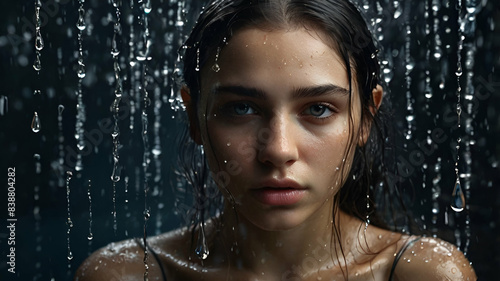 © A_Katchy, Fototapeta premium Captivating Sadness: Long-Haired Woman in Realistic Water Droplet Scene