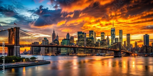 © Man888, Fototapeta premium Captivating Silhouette Photography of Manhattan's Urban Landscape at Dusk, Showcasing Iconic Skyscrapers and City Lights Against a Vibrant Sunset Sky in New York City