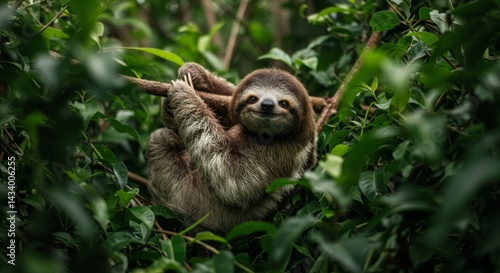Fototapeta premium Captivating sloth suspended from a branch amidst dense foliage expressing...
