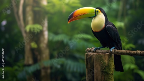 Naklejka premium Captivating Solitary Toucan Perched on a Natural Log Amidst Lush Greenery in a Tropical Forest Setting, Showcasing Vivid Colors and Serenity of Wildlife
