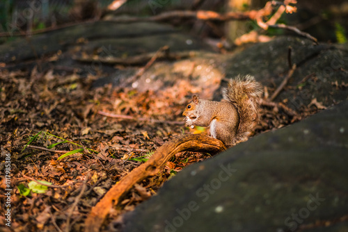 © Bento, Fototapeta premium Captivating Squirrel in Woodland Area Holding Nut Amongst Fallen Leaves and Twigs in Bright Afternoon Light, Showcasing Natural Autumn Forest Habitat and Wildlife Behavior