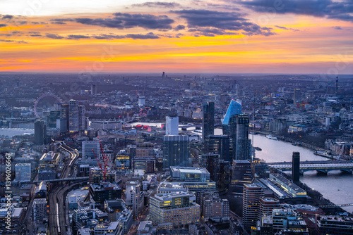 © pyty, Fototapeta premium Captivating sunset unfolds over London, showcasing the skyline from The Shard. The vibrant colors paint the sky as the city winds down into twilight, offering a breathtaking perspective.