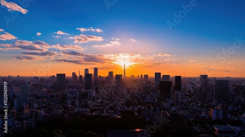 Obraz premium Captivating sunset view of Tokyo's skyline, blending traditional and modern...