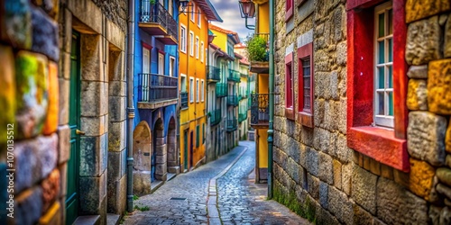 © Four888, Fototapeta premium Captivating Tilt-Shift Photography of an Old Narrow Alley Street Wall in Porto, Showcasing Vibrant Textures and Colors in a Quaint Urban Landscape