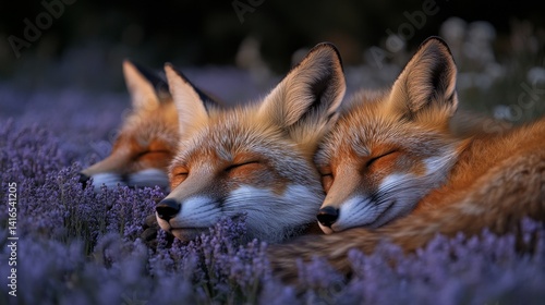 © Artajar, Fototapeta premium Captivating_Trio_of_Red_Foxes_Resting_Tranquilly_Amongst_a_Vibrant_Field_of_Purple_Flowers_during_a_Serene_Evening_Scene