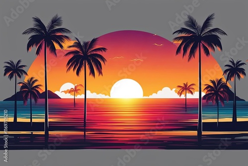 Naklejka premium Captivating tropical scene with vivid sunset colors, palm trees framing...