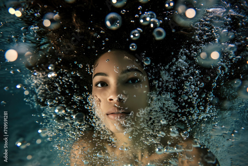 © Anastasiia, Obraz premium Captivating Underwater Portrait: Model Enveloped In Bubbles, Perfect For Advertisements