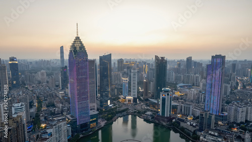 © zhouyilu, Fototapeta premium Captivating Urban Skyline at Sunset Overlooking a Serene Lake
