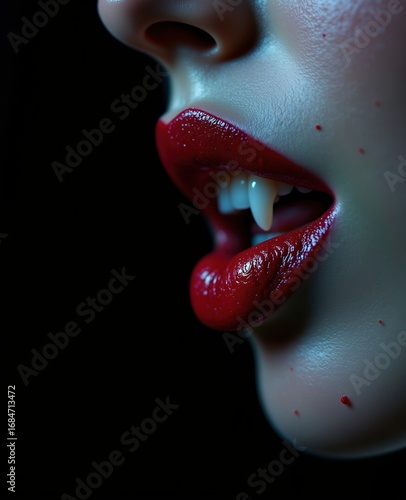 © Teerapat, Obraz premium Captivating Vampire Lips with Dramatic Red Gloss and Fangs
