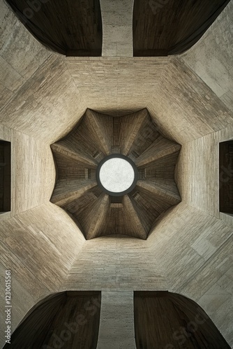 © KerXing, Fototapeta premium Captivating view of a geometric architectural ceiling with a central circular light, showcasing modern design and symmetry.