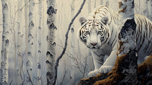 Fototapeta premium Captivating watercolor artwork depicting a white tiger surrounded by woodland scenery.