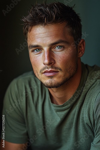 Fototapeta premium Captivating young man with striking blue eyes and relaxed expression sitting indoors during soft natural light