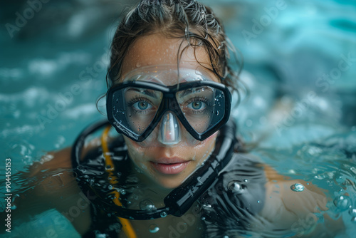 Fototapeta premium Captivating Young Woman Engaging in Scuba Diving Lessons in Clear Blue Waters