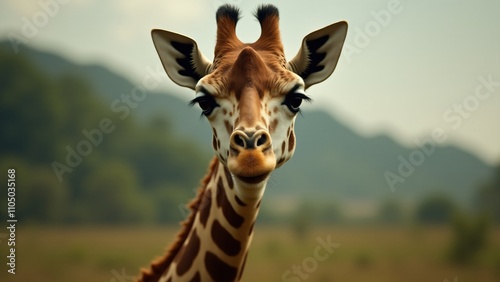 © Ernesto, Naklejka premium Capture a close-up of a giraffe’s face, emphasizing its expressive eyes, long neck, and unique spots. Natural light highlights its graceful, majestic presence against a soft, blurred background.