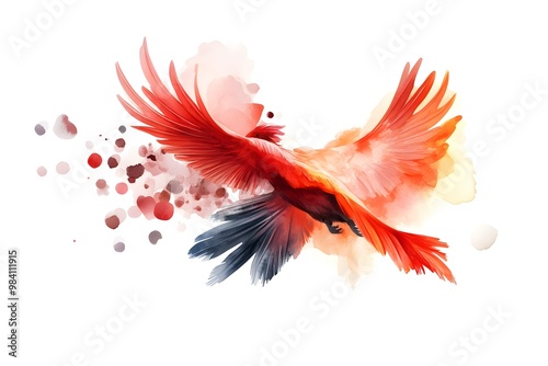 Fototapeta premium Capture a majestic Phoenix in flight, feathers glowing in fiery hues, set against a stark white backdrop