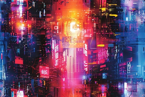 © panyawatt, Fototapeta premium Capture a panoramic view of a bustling metropolis merging futuristic technologies with the fluidity of impressionism, using vibrant hues and dynamic brushstrokes